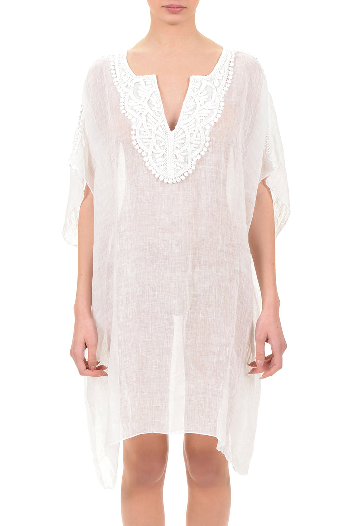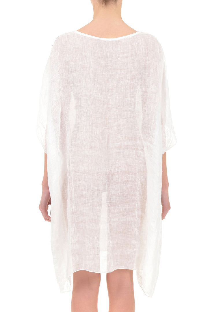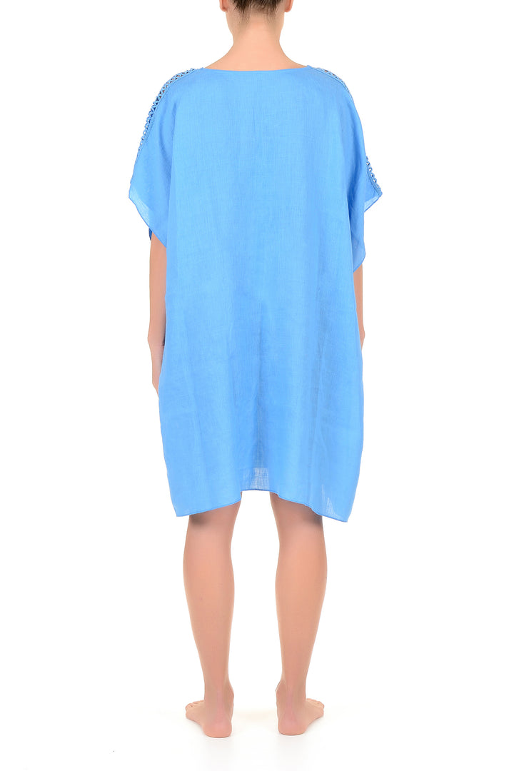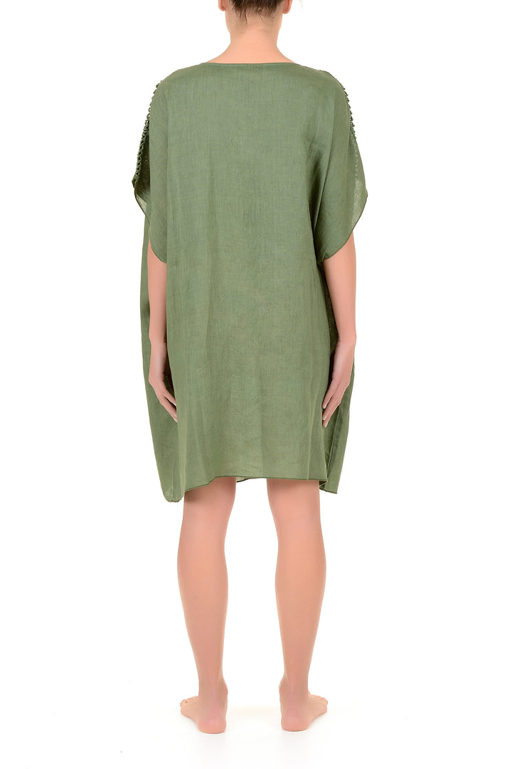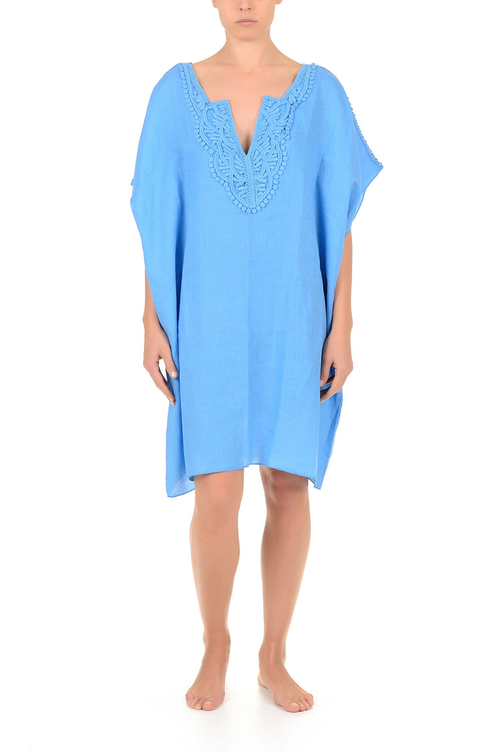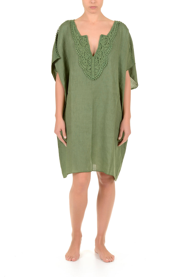 Dieser Kaftan aus reinem Leinen mit einem Ausschnitt, der durch zarte Stickereien veredelt ist, garantiert Leichtigkeit und Atmungsaktivität, ideal für die Sommersaison. Das fließende und uneingeschränkte Design sorgt den ganzen Tag über für Komfort, während die Qualität des natürlichen Materials ihn zu einer bewussten und langlebigen Wahl macht. Perfekt für alle, die Eleganz ohne Kompromisse suchen.