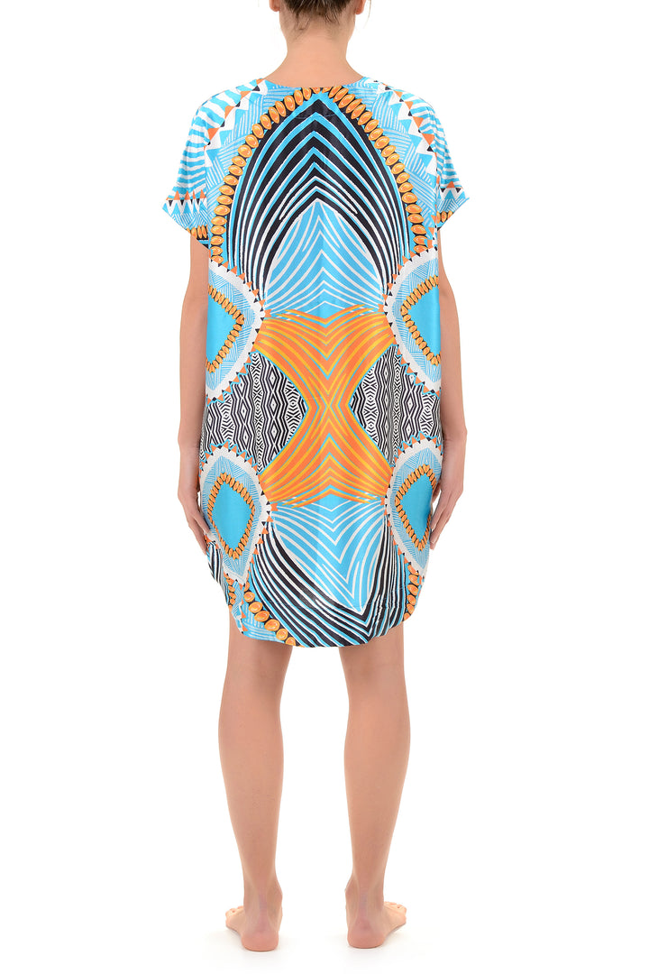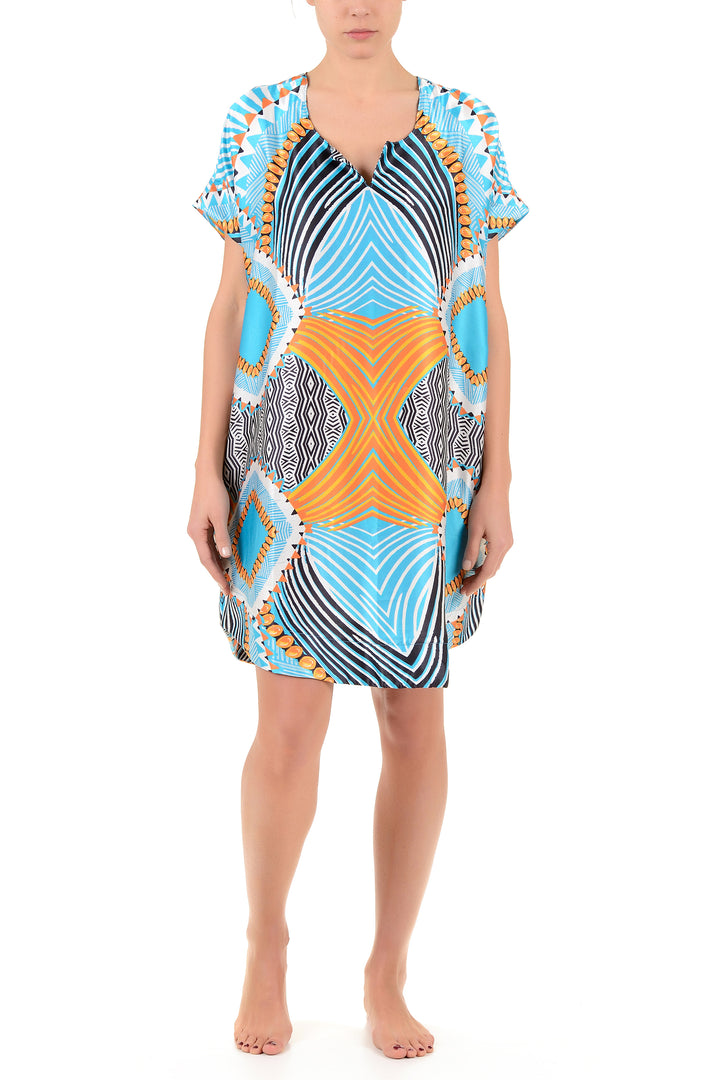 Dieses Kaftan in ethnischen fantasien fängt die Essenz der mediterranen Tradition ein. Hergestellt aus leichten und atmungsaktiven Stoffen, zeichnet sich dieses Kleidungsstück durch geometrische und lebendige Details aus. Die weite und fließende Silhouette garantiert Komfort und Bewegungsfreiheit, perfekt für Sommertage am Strand oder für einen eleganten Abend. Ein vielseitiges Stück, das Boho-Stil und Raffinesse vereint, ideal für diejenigen, die eine anspruchsvolle Alternative zu klassischen Badeanzügen suchen.