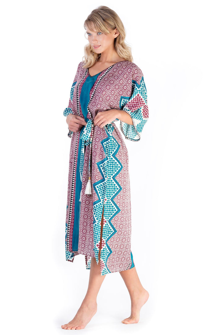Dieser elegante Kaftan verfügt über einen abnehmbaren Gürtel in leben, der die Silhouette betont, sowie seitliche Schlitze für mehr Komfort und Bewegungsfreiheit. Hergestellt mit einem Druck, der von ethnischen Mustern inspiriert ist, verbindet er Stil und Praktikabilität und macht ihn zu einer idealen Wahl sowohl für legere Sommeranlässe als auch für gehobenere Gelegenheiten.
