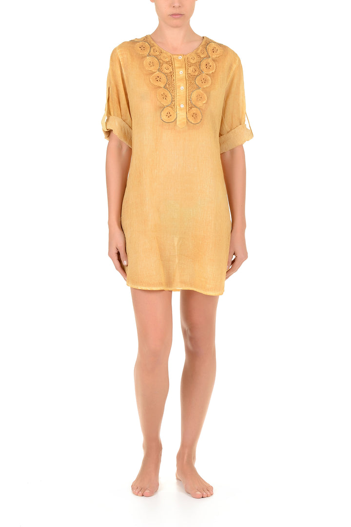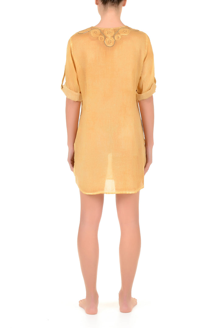 Dieser Kaftan aus reinem Baumwollstoff mit seitlichen Schlitzen ist perfekt für alle, die Komfort und Eleganz ohne Kompromisse suchen. Der Stoff garantiert optimale Atmungsaktivität und Weichheit auf der Haut, ideal für Sommertage oder einen Urlaub am Meer. Die fließende Silhouette mit seitlichen Details sorgt für Bewegungsfreiheit und eine entspannte Passform, die die Figur betont. Ein vielseitiges Kleidungsstück, das am Strand oder in der Stadt getragen werden kann und sich leicht mit verschiedenen Accessoires und Schuhen kombinieren lässt.