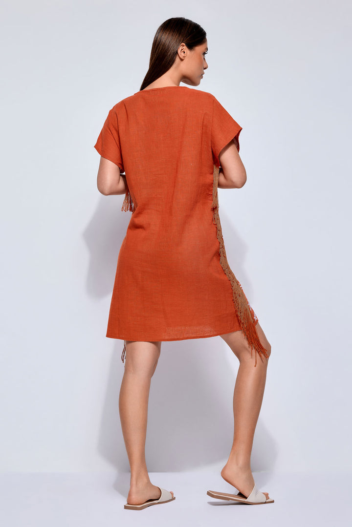 Produktbeschreibung: Der Leinen-Misch-Kaftan Harmonies besteht aus Seiden- und Baumwollstoff mit ausgestelltem Schnitt, der sich perfekt an jede Körperform anpasst. Sein V-Ausschnitt und die kurzen Ärmel machen diesen Kaftan elegant und bequem. Die handgestickten Blumenmotive und die seitlichen Fransen sorgen für einen Hauch von Raffinesse, während die Knielänge es perfekt für jeden Anlass macht.