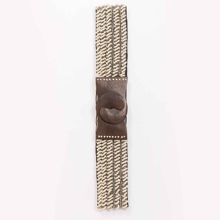 Dieser Gürtel ist aus kunstvoll verarbeiteten Perlen gefertigt und zeichnet sich durch einen raffinierten Holzverschluss aus, der einen Hauch von natürlicher Eleganz verleiht. Ein vielseitiges Accessoire, das Handwerkskunst und zeitgenössisches Design kombiniert und perfekt ist, um jedes Outfit mit Stil und Persönlichkeit zu vervollständigen.
