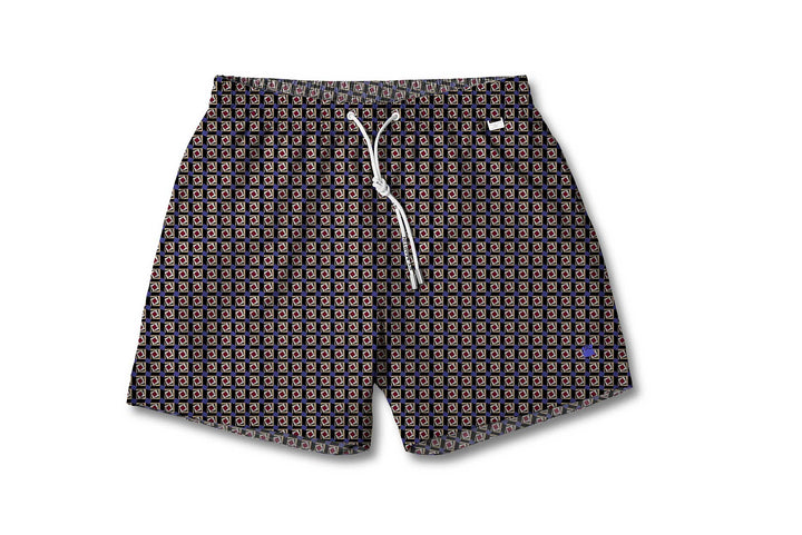 Boxershorts-Badeanzug mit optischem Muster aus quadratischen Punkten, das die Essenz des mediterranen Stils einfängt. Die mittlere Beinlänge bietet Vielseitigkeit zwischen Strand und Pool, während der weiche Stoff den ganzen Tag über Komfort garantiert. Feine Details umfassen einen verstellbaren elastischen Bund, eine funktionale Tasche mit Klappe auf der Rückseite und eine zarte Krabbenstickerei, die Charakter verleiht. Reguläre Passform für eine natürliche und kompromisslose Silhouette.