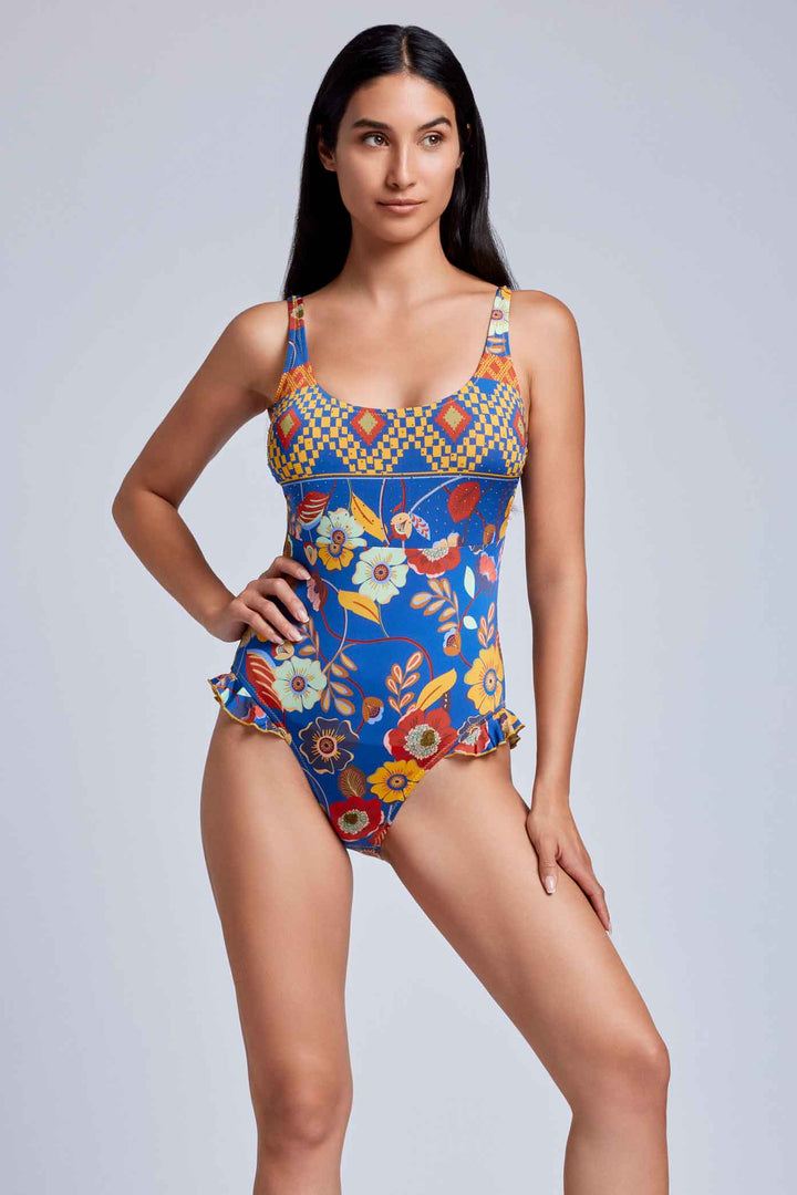 EINTEILIGER BADEANZUG MIT BLUMENRÜSCHEN
