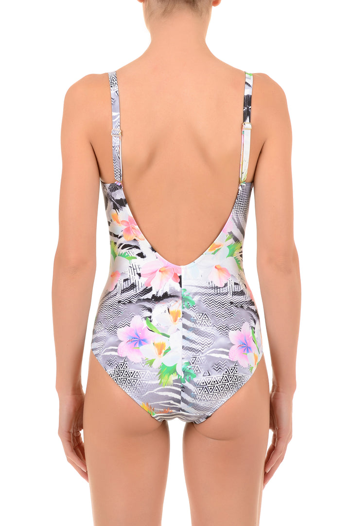 Dieser gemusterte Badeanzug vereint Stil und Funktionalität dank verstellbarer Träger für eine individuelle Passform. Herausnehmbare Cups bieten verstellbaren Halt, während der formende Stoff die Silhouette betont und für optimalen Komfort und einen definierten Look sorgt. Ideal für alle, die Eleganz suchen, ohne auf Halt zu verzichten.