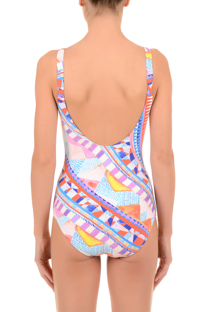 Dieser einteilige Badeanzug besticht durch seinen eleganten Rundhalsausschnitt und sein markantes Muster, das die Figur betont. Die Schmuckdetails an den Trägern verleihen ihm einen Hauch von edlem Glanz und machen ihn ideal für alle, die Stil und Komfort in einem Stück suchen. Perfekt, um am Strand oder Pool mit Klasse aufzufallen.