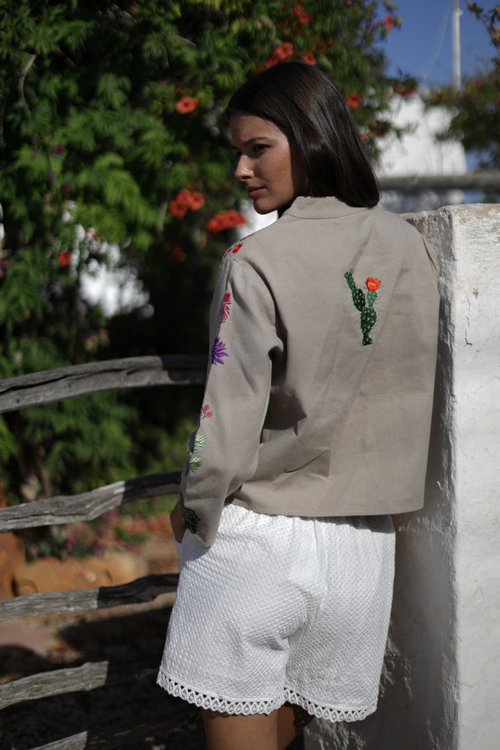 Jacke mit handgefertigten Stickereien. Boho-inspiriert. Sie zeichnet sich durch kontrastreiche Stickereien vorne, hinten und an den Ärmeln aus. Mit tunesischem Kragen. Lange Ärmel. Vorderseite mit Knöpfen aus gealtertem Metall und Taschen. Die Stickereien und Blumenmuster sind die wahren Highlights dieses Kleidungsstücks, hier wird die feine und handwerkliche Verarbeitung hervorgehoben, die es so besonders macht. Hergestellt aus leichtem Baumwollstoff. Mit Blumenfutter. Es wird empfohlen, eine Nummer größer als üblich zu wählen. Die Kaktusjacke wird zum perfekten Accessoire, um deinem Look eine bohemienhafte und raffinierte Note zu verleihen!
