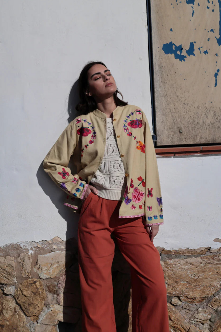 Jacke im romantischen Stil. Super elegant, sie ist aus Baumwolle in Beigetönen gefertigt. Sie zeichnet sich durch ihre zarten Stickereien mit bunten Schmetterlingen aus, die ihr eine fröhliche und raffinierte Ausstrahlung verleihen. Mit leichtem und vielseitigem Design verfügt sie über lange Ärmel mit lockerem, nicht anliegendem Schnitt. Der vordere Verschluss mit Metallknöpfen und der elegante Stehkragen unterstreichen ihren charakteristischen Stil.