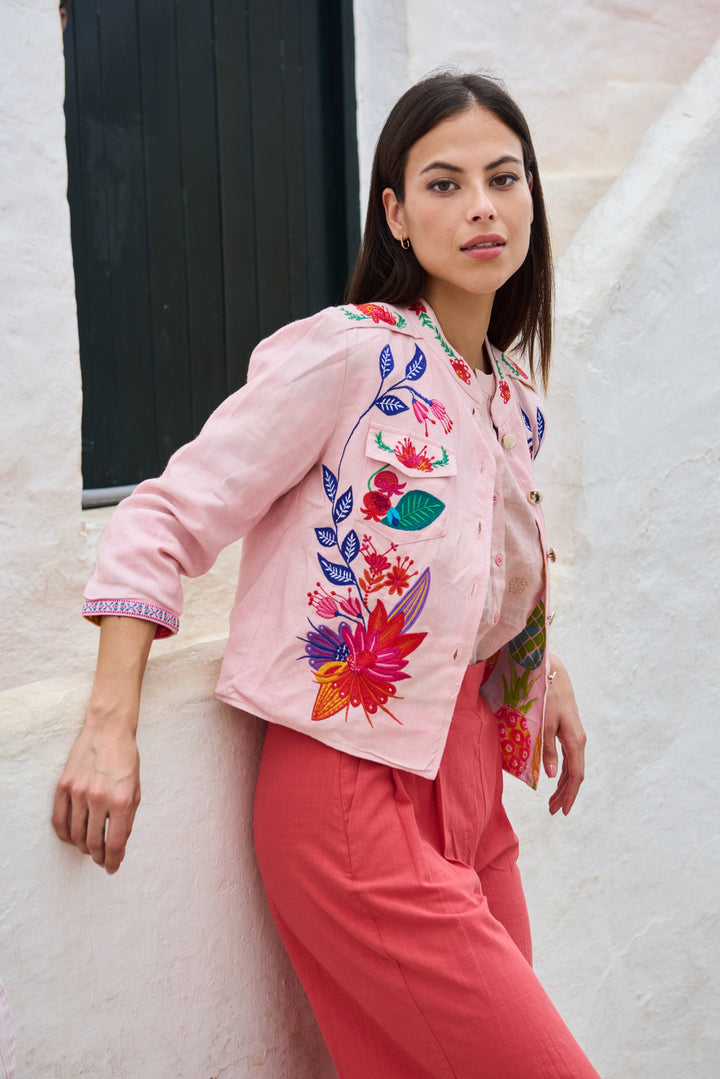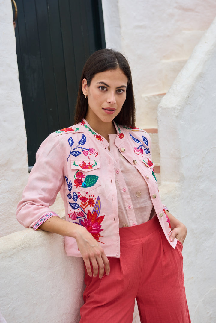 Jacke im romantischen Stil. Super elegant, sie ist aus Baumwolle in Rosatönen gefertigt. Sie zeichnet sich durch ihre zarten, farbigen Stickereien aus, die ihr eine fröhliche und raffinierte Ausstrahlung verleihen. Mit leichtem und vielseitigem Design verfügt sie über locker geschnittene Ärmel, die nicht eng anliegen. Der vordere Verschluss mit Metallknöpfen und der elegante Stehkragen unterstreichen ihren charakteristischen Stil.