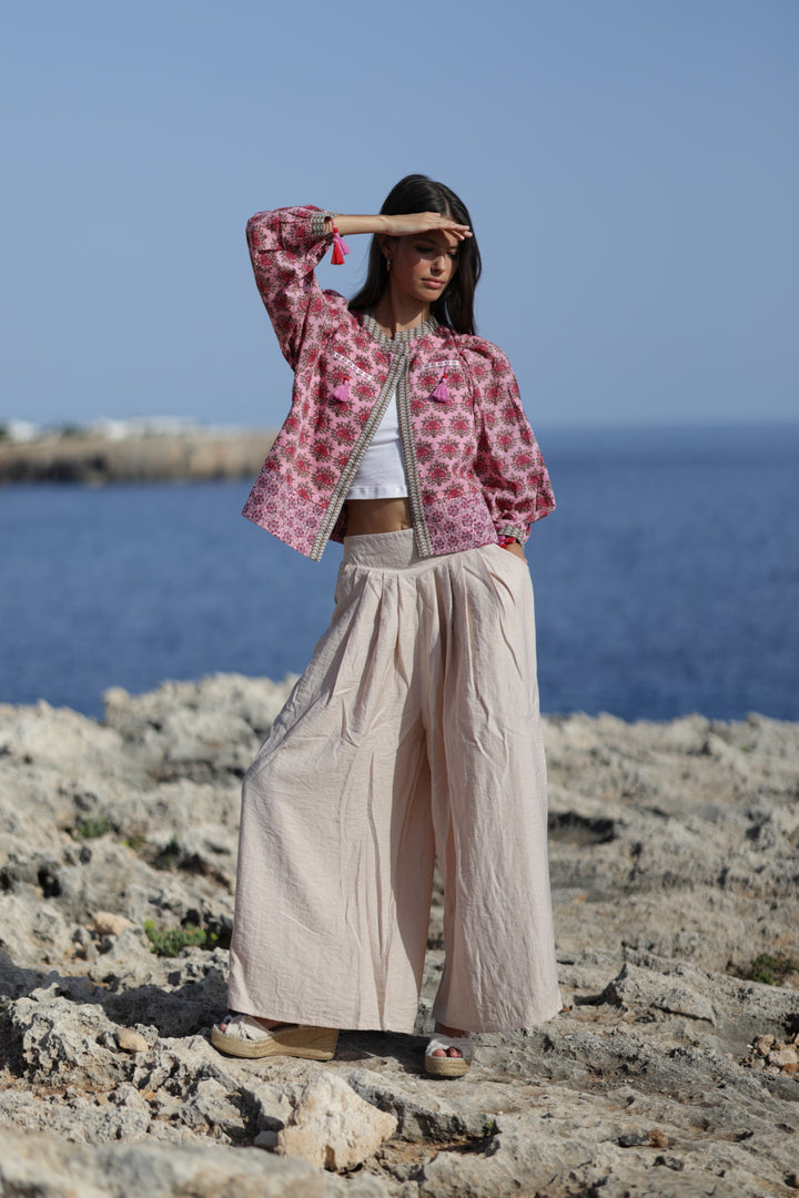 Jacke mit romantischer Inspiration. Perfekt, um jedem Look eine raffinierte und unverwechselbare Note zu verleihen. Auf der Vorderseite verleihen die Taschen mit Besätzen und Quasten ein bohème Detail, das den Charme verstärkt.