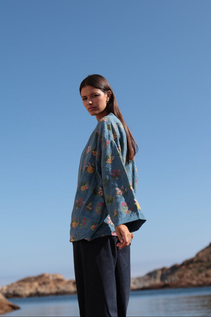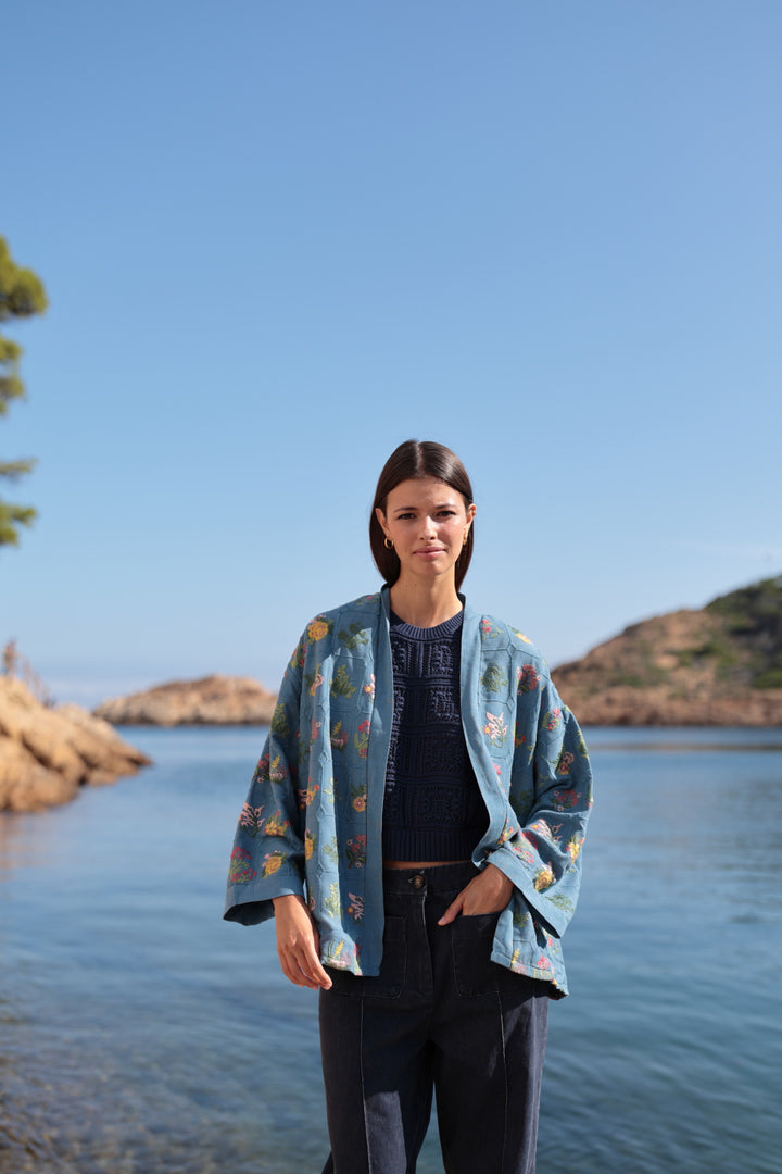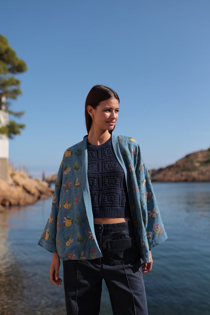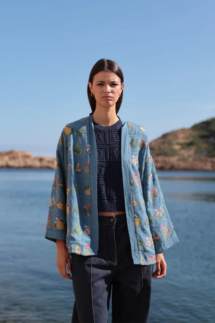 Diese Kimono-Jacke ist ein Kleidungsstück, das die Essenz des Boho-Stils mit einer romantischen Note einfängt. Hergestellt mit zarten Blumenstickereien und botanischen Mustern, vermittelt ihr Design Weiblichkeit und Eleganz. Ohne Verschluss und mit freiem Fall bietet sie eine fließende und natürliche Bewegung. Die langen, weiten Ärmel betonen die entspannte Ästhetik, während der tonale Saum, der entlang des gesamten Saums verläuft, eine raffinierte Note hinzufügt.