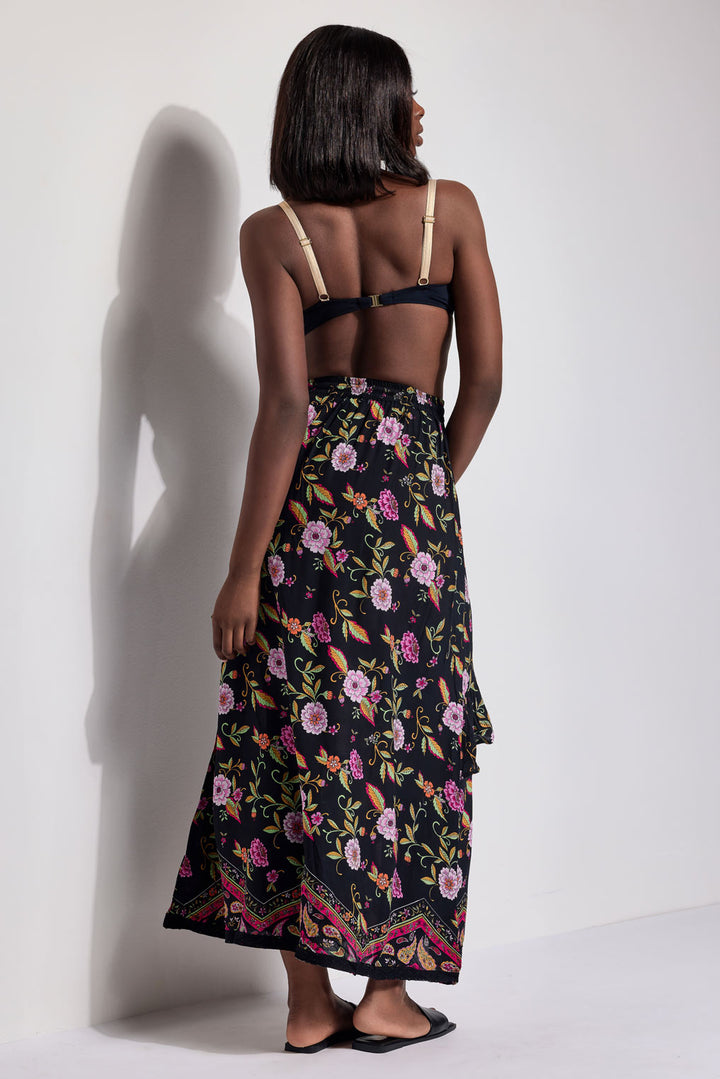 Rock lang mit fantasie Muster, ausgestattet mit einem elastischen leben für eine bequeme Passform. Der zentrale Volant sorgt für Bewegung, während das Spitzen-Detail am Saum einen Hauch von Eleganz verleiht. Perfekt für einen boho-chic und romantischen Look, ideal für die Sommersaison.