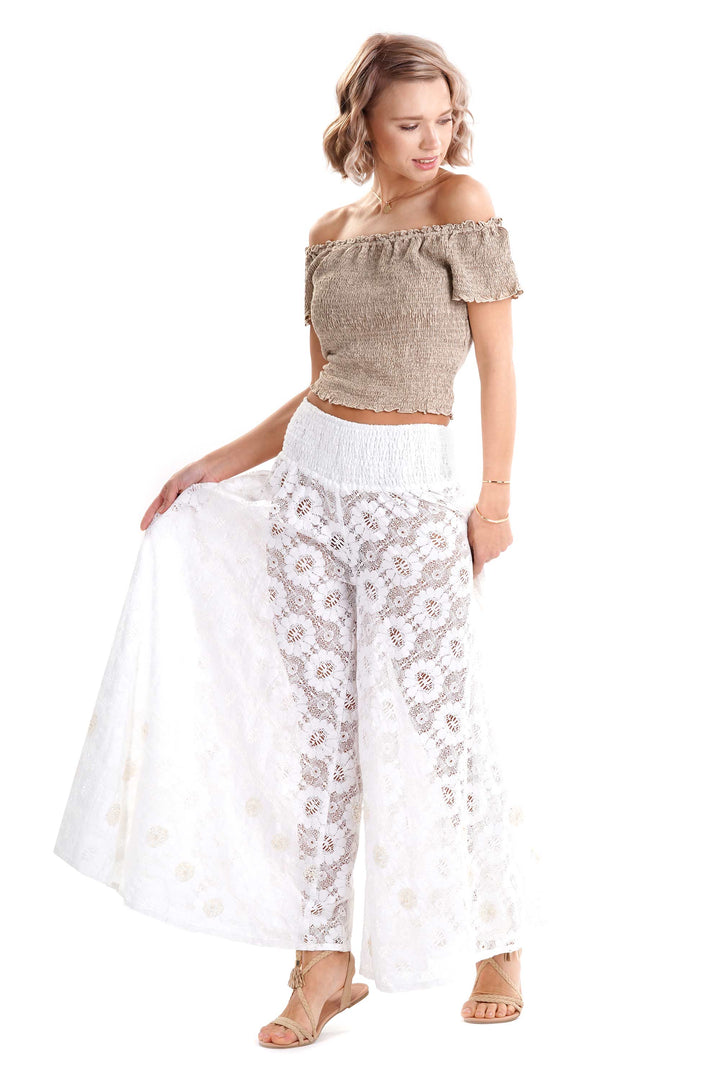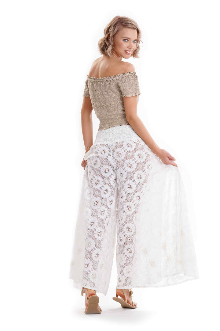 Diese langen Hosen aus reinem Baumwolle mit elastischem Bund im leben sind mit Makramee-Spitzendetails veredelt, die dem Kleidungsstück Eleganz und Raffinesse verleihen. Ideal für diejenigen, die handwerkliche Qualität und zeitgenössischen Stil suchen, perfekt für legere und halbformelle Anlässe. Eine zugängliche Essenz von Luxus, die die Silhouette mit zurückhaltender Raffinesse betont.