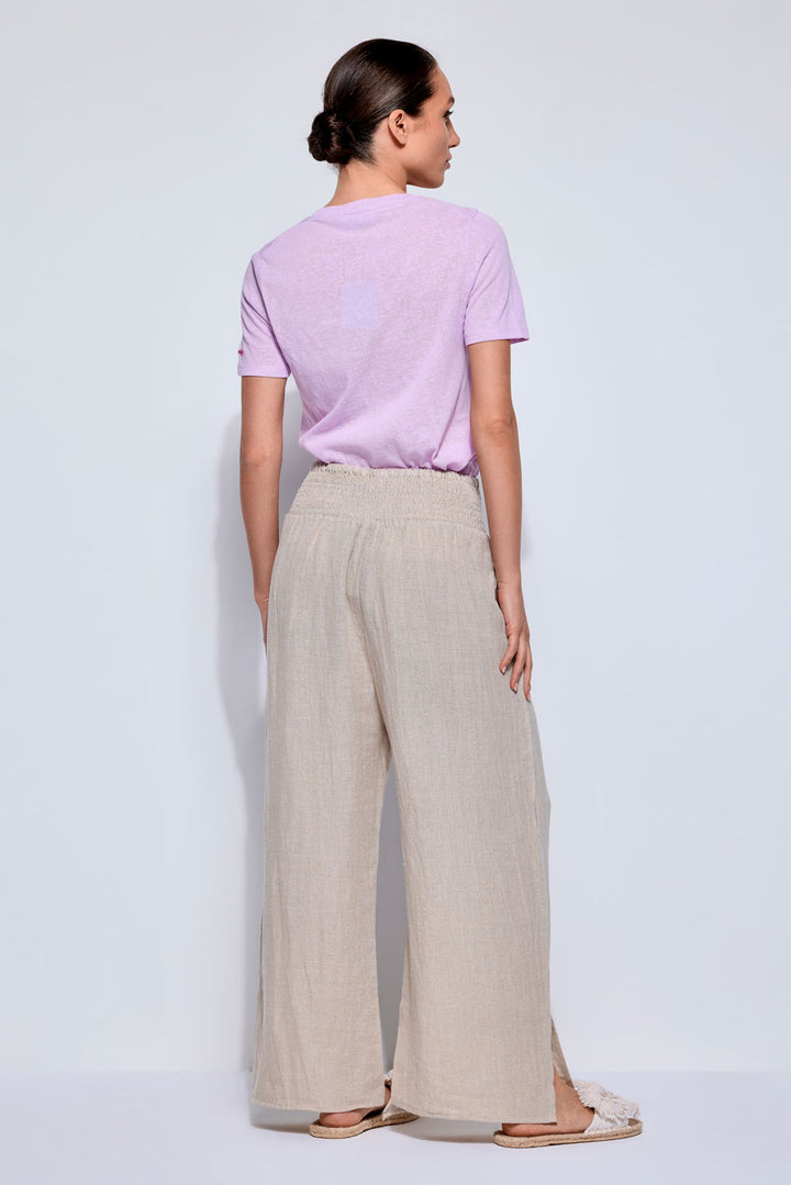 Diese langen Hosen aus reinem Leinen bieten dank des elastischen Bundes im leben eine bequeme Passform, die Praktikabilität und Anpassungsfähigkeit gewährleistet. Die seitlichen Schlitze verleihen einen Hauch von Eleganz und erleichtern die Bewegung, was sie ideal für eine raffinierte und atmungsaktive Sommerbekleidung macht. Die Qualität des Leinens sorgt für Frische und Langlebigkeit, perfekt für alle, die Stil und Funktionalität in einem leichten und natürlichen Kleidungsstück suchen.