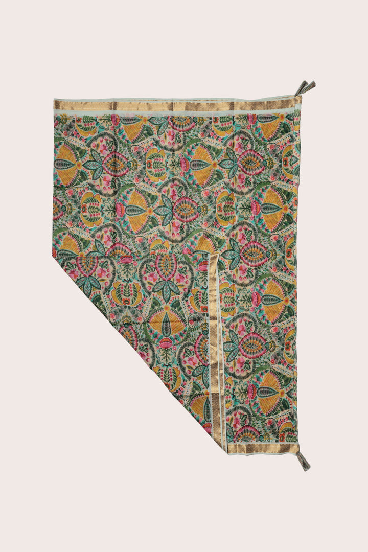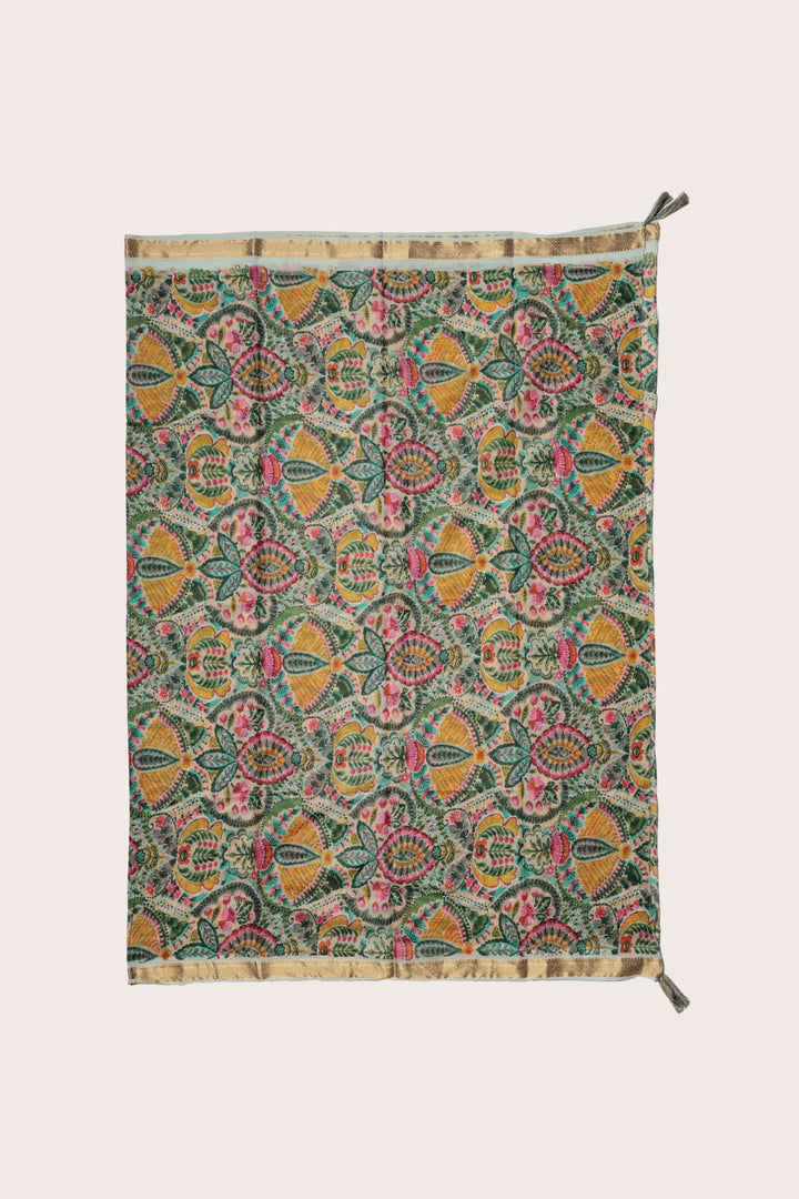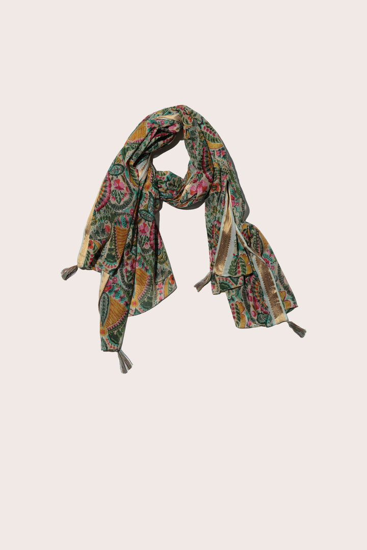 Pareo mit einem Mosaikdruck, der florale Formen und von der orientalischen Kunst inspirierte Muster aufgreift, wird dieses Accessoire zum Blickfang jedes Looks. Die perfekte Wahl für alle, die Details und Farben lieben, die für sich selbst sprechen. Hergestellt aus einem weichen und fließenden Stoff, ist es mit zarten goldenen Rändern veredelt.