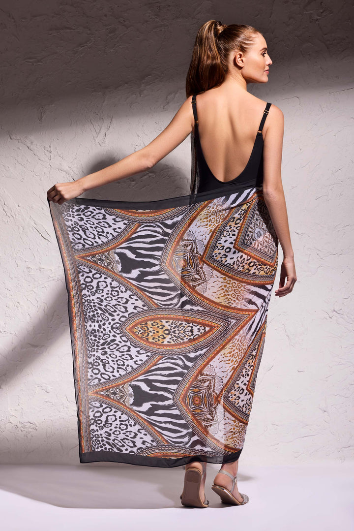 Dieses Pareo-Tuch vereint fantasie maculata und zebrata für einen raffinierten und dynamischen Effekt. Vielseitig, kann es auf verschiedene Weise getragen werden: um den Hals gebunden, als Stirnband oder als Rock, und passt sich leicht jedem Sommerlook an. Hergestellt aus leichten Materialien, garantiert es Komfort und Stil am Strand oder in der Stadt.