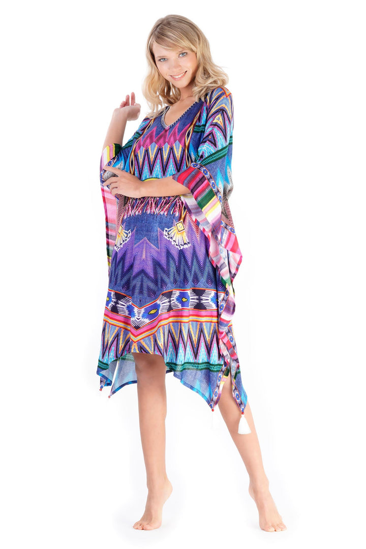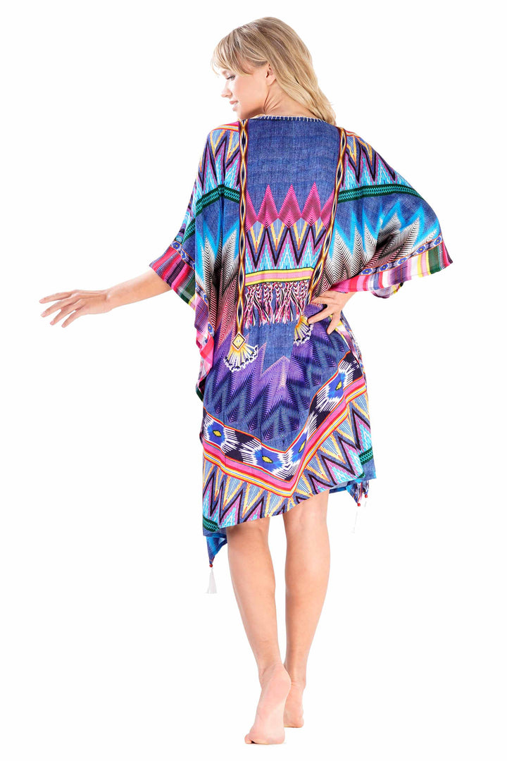 Dieser Poncho verfügt über einen raffinierten V-Ausschnitt und eine fantasie, die von ethnischen Mustern inspiriert ist und einen Hauch kultureller Eleganz verleiht. Sein einzigartiges Design beinhaltet Quasten am Saum, die dezent Bewegung und Textur hinzufügen.