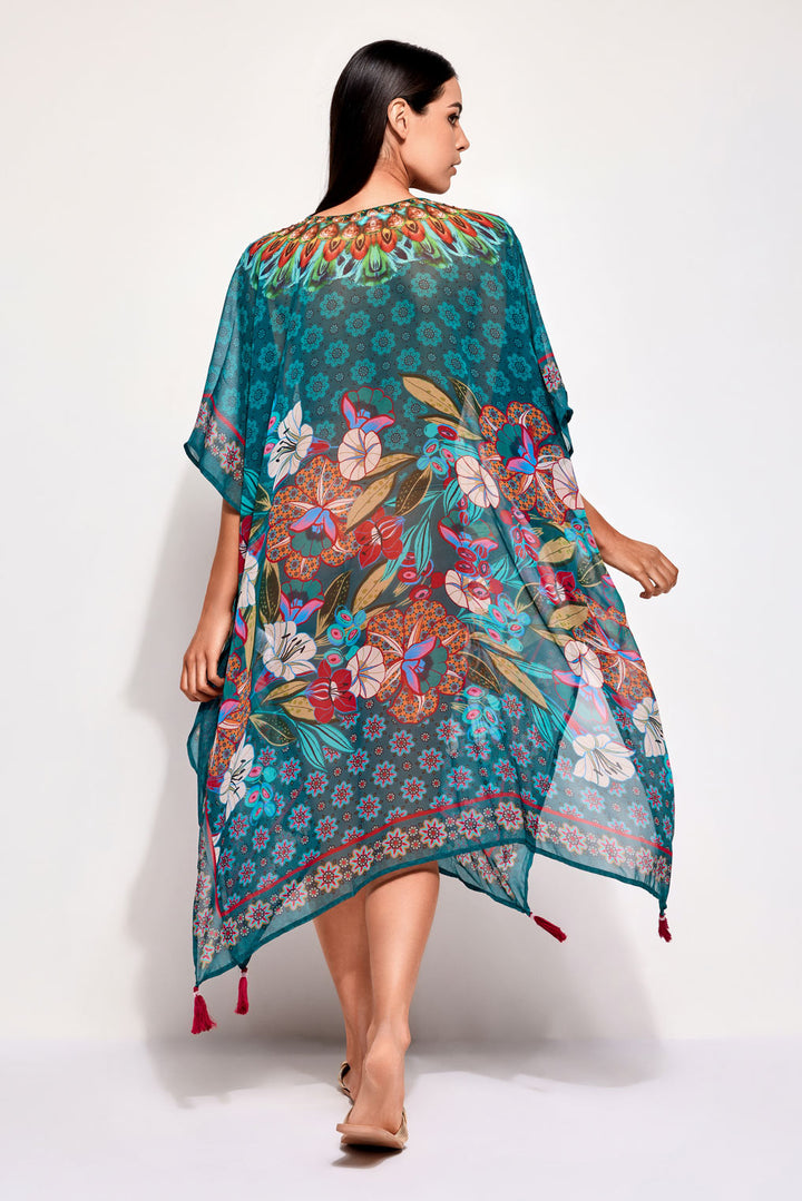 Der Isla Mujeres Poncho verleiht Ihrem Outfit mit seinem langen Modell und dem einzigartigen fantasia einen Hauch von Blumenstil. Der V-Ausschnitt und die Fledermausärmel bieten unvergleichlichen Komfort, während die Seitenschlitze und Quasten am Ende Ihrem Look Bewegung und Schwung verleihen.