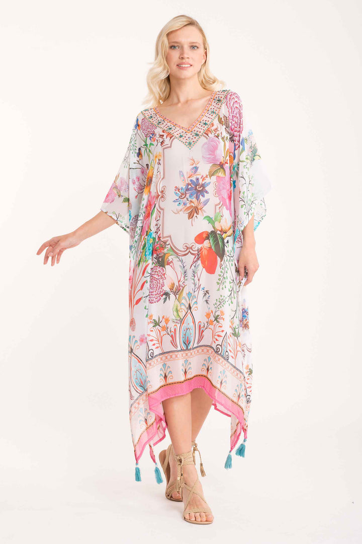 Dieser lange Poncho mit eleganter fantasie floreale ist mit Quasten am Saum verziert, die eine Note von Bewegung und Raffinesse hinzufügen. Ideal für alle, die ein vielseitiges und stilvolles Kleidungsstück suchen, das jedes Outfit mit einem Hauch natürlicher Eleganz aufwertet.