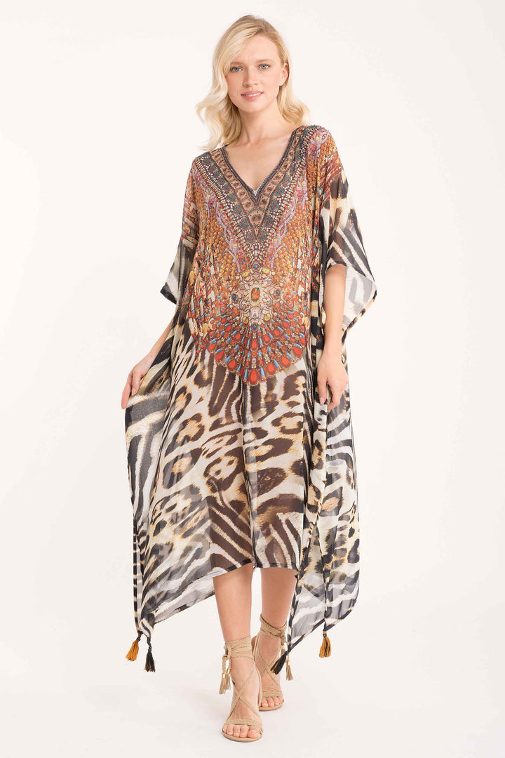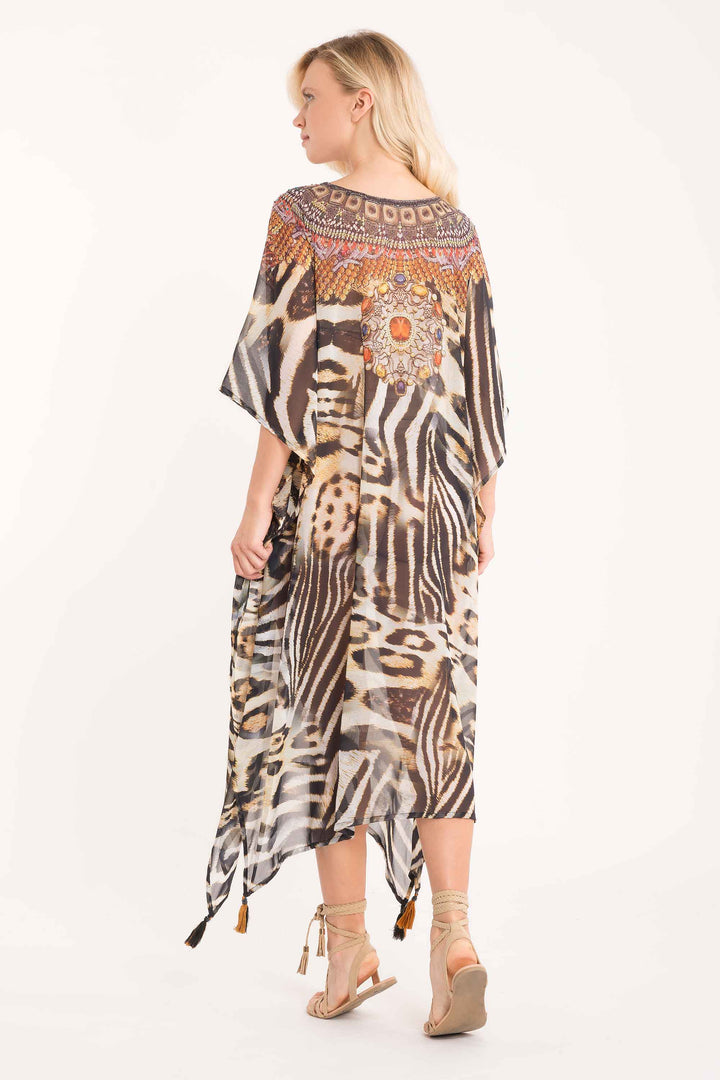 Dieser lange Poncho in fantasie animalier fängt die Essenz des Boho-Stils ein. Ausgestattet mit eleganten seitlichen Schlitzen, die mit Quasten verziert sind, bietet dieses Kleidungsstück Bewegung und Fluss bei jedem Schritt. Die großzügige Silhouette garantiert kompromisslosen Komfort, während das animalier-Muster einen zeitgenössischen, raffinierten Akzent setzt.