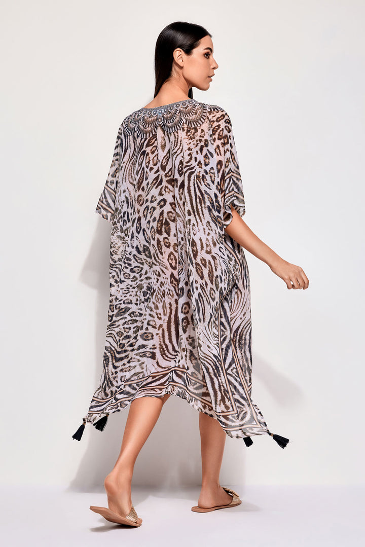 Bringen Sie Ihren Charme mit diesem raffinierten Poncho mit Animal-Print zum Ausdruck. Das lange Modell und der V-Ausschnitt sorgen für einen Hauch von Eleganz, während die Fledermausärmel und Seitenschlitze für Komfort und Bewegungsfreiheit sorgen. Die Quasten am Ende verleihen Ihrem Look einen Hauch von Stil.