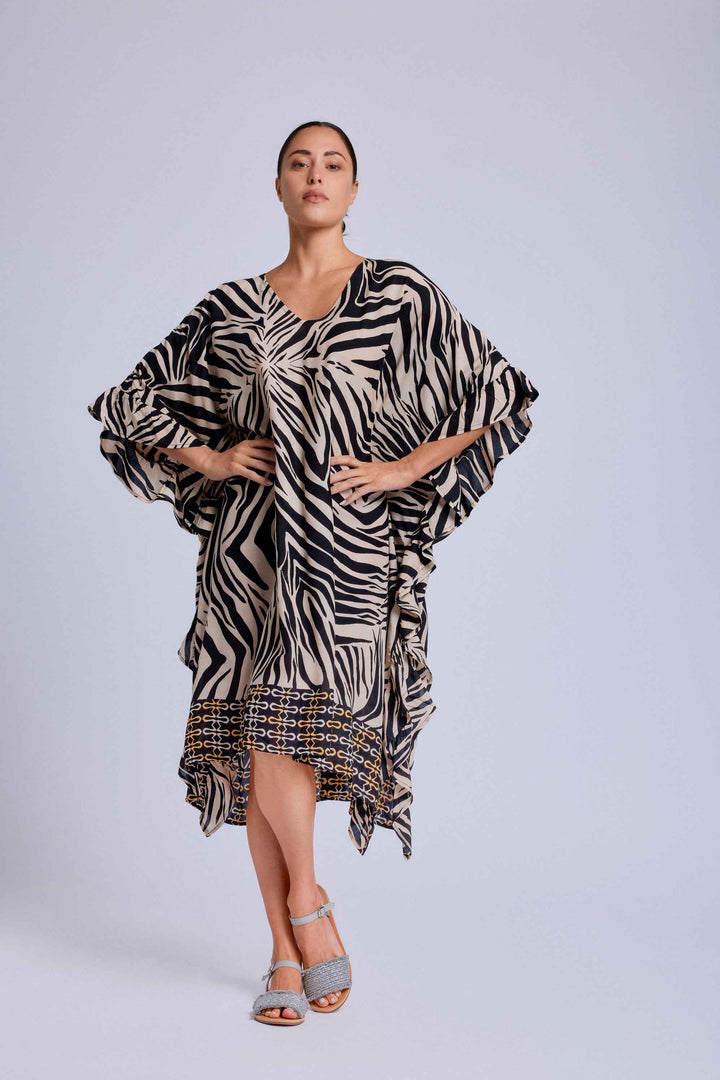 Langer Poncho aus weichem Stoff mit faszinierender zebrafarbener fantasie. Die Fledermausärmel sorgen für eine elegante und fließende Silhouette, perfekt für Sommerabende am Meer oder einen stilvollen Aperitif. Ein vielseitiges Kleidungsstück, das sich leicht mit Ihren Urlaubsoutfits kombinieren lässt und jeden Moment in eine Gelegenheit mediterranen Luxus verwandelt.
