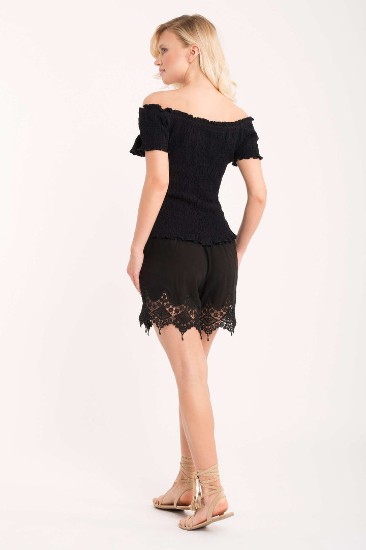 Die Shorts mit elastischem Bund am leben, verziert mit Stickereidetails, die dem Kleidungsstück einen Hauch von Eleganz und Persönlichkeit verleihen, sind perfekt für diejenigen, die Qualität und Stil suchen. Diese Shorts verbinden Praktikabilität und Raffinesse, ideal für eine moderne und gepflegte Silhouette.