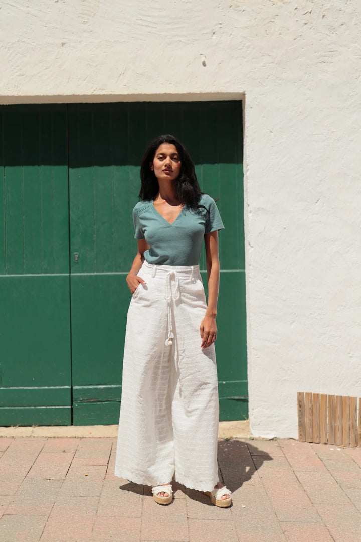 Dieses T-Shirt mit V-Ausschnitt ist perfekt für einen femininen und eleganten Look. Die Einsätze aus eingelegter Spitze verleihen dem Shirt eine raffinierte Note. Die Farbe ist vielseitig und lässt sich leicht mit anderen Kleidungsstücken in deinem Kleiderschrank kombinieren. Füge deinem Outfit mit diesem T-Shirt Stil hinzu.