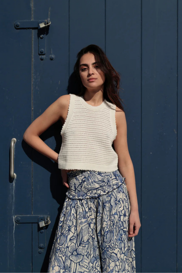 Top voller Charme und Weiblichkeit. Hergestellt aus weißem Baumwoll-Crochet, verfügt es über einen runden Ausschnitt, der seine Schlichtheit betont.
