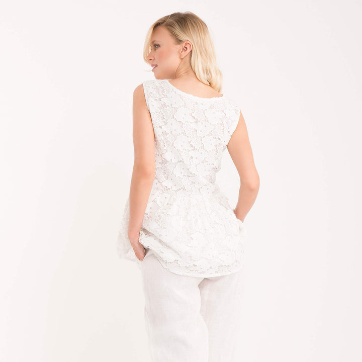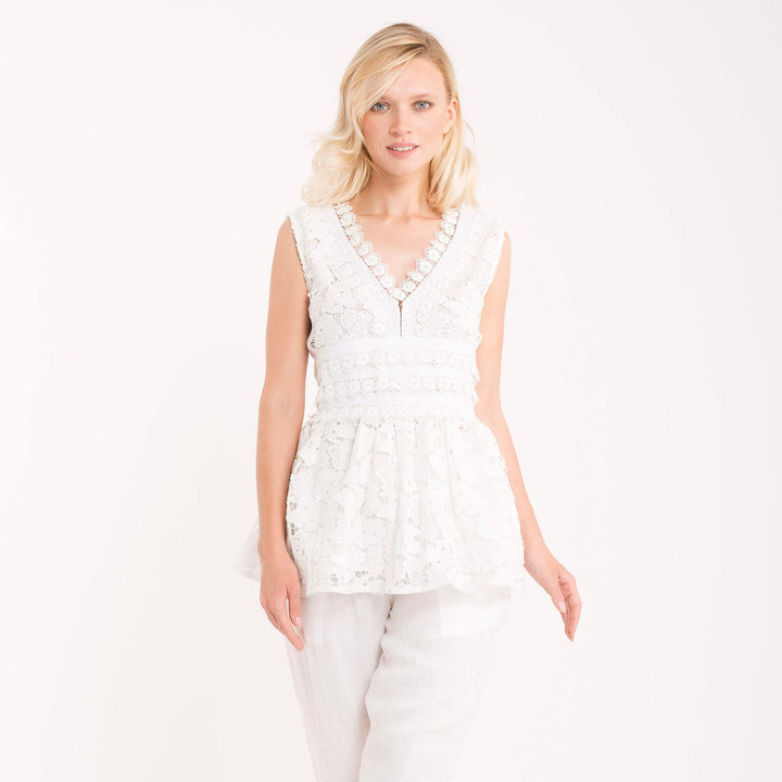Dieses Top zeichnet sich durch feine Spitzenstickereien aus, die eine raffinierte Textur und eine anspruchsvolle Ästhetik verleihen. Der V-Ausschnitt betont die Silhouette mit einer klassischen und femininen Linie und schafft einen schlankmachenden Effekt. Die mit handwerklicher Präzision gearbeiteten Spitzendetails garantieren eine überlegene Qualität und eine makellose Passform. Perfekt für besondere Anlässe oder um Ihre Alltagsgarderobe mit einem Hauch zeitloser Raffinesse zu veredeln.